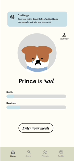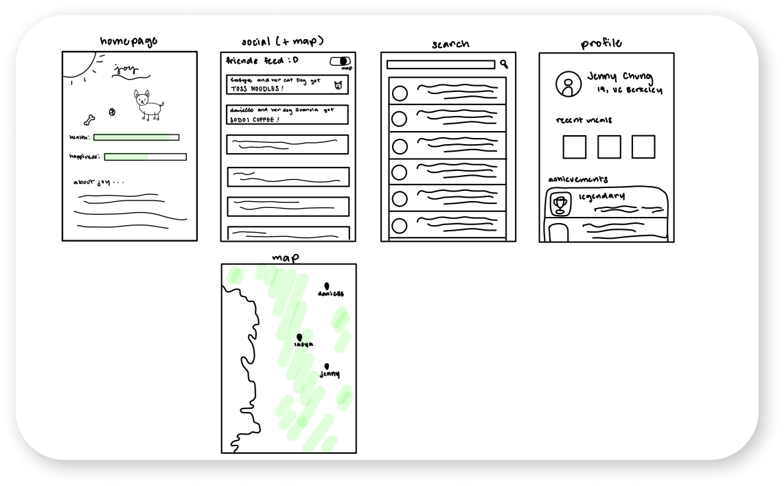 The Lo-Fi prototype outlined the core functions we aimed to implement: a homepage inspired by childhood Tamagotchi toys, a social tab to integrate a shareable aspect of sustainability, and a personal profile page for intuitive meal tracking.