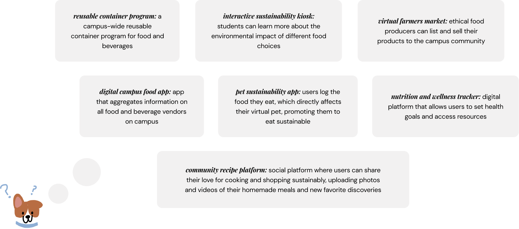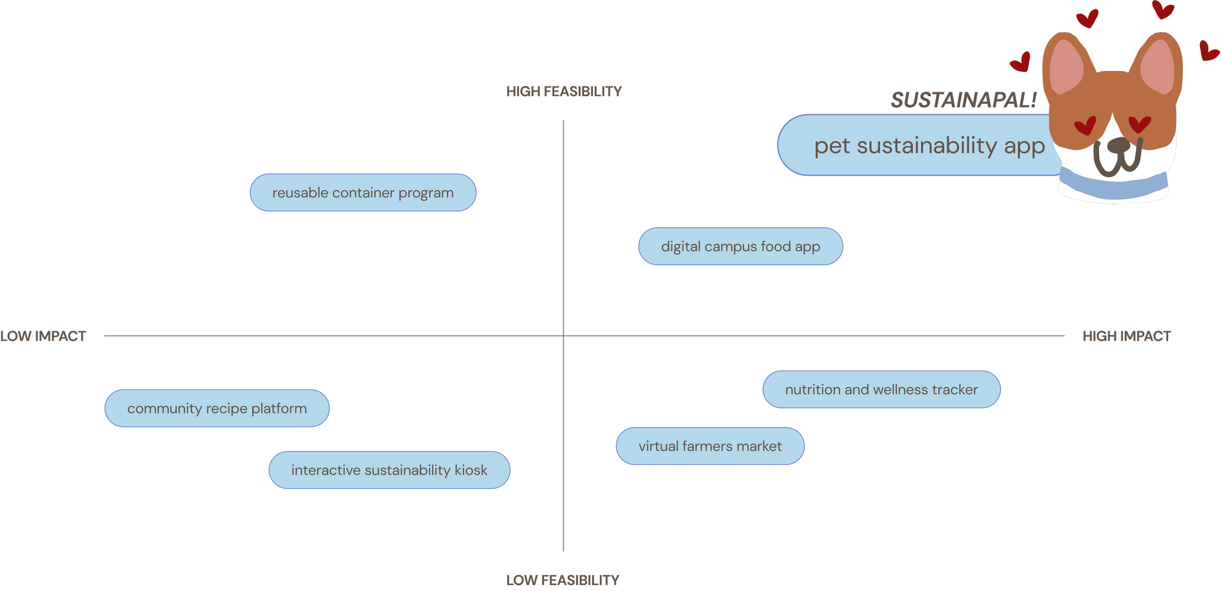 From the 2x2 matrix, we decided upon SustainaPal for its high evaluation score and appeal to the Gen-Z college generation, via our findings in secondary research.