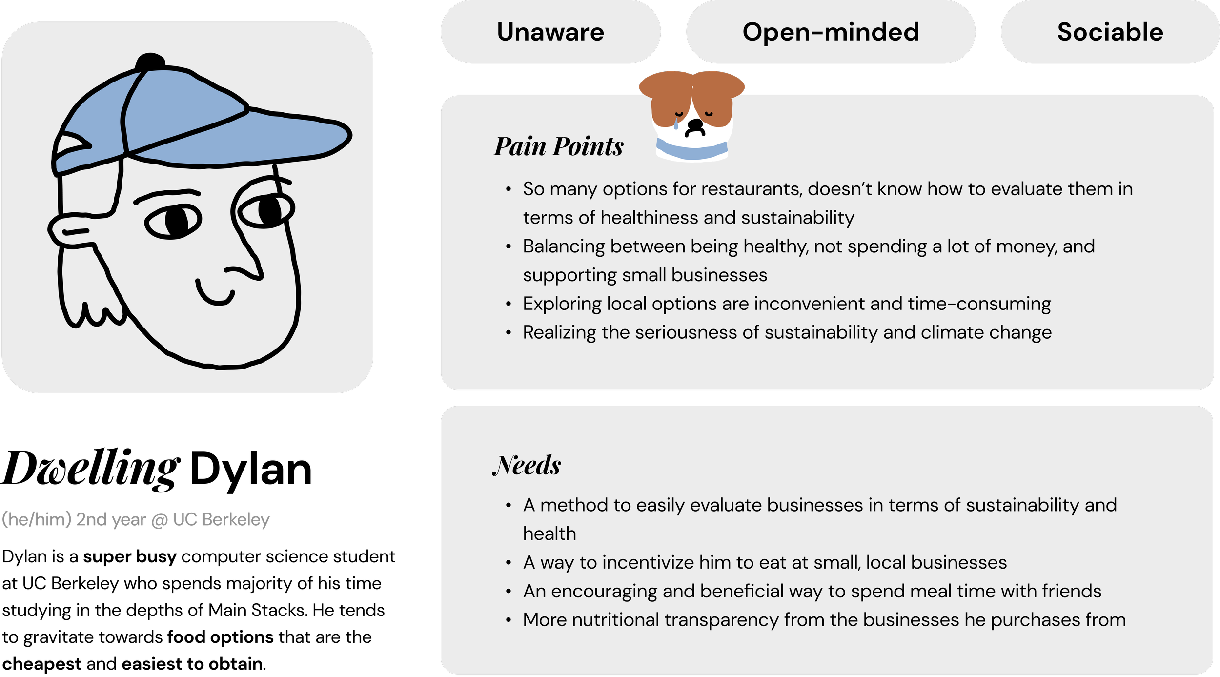 Dylan's persona embodies the typical UC Berkeley student, capturing the financial and time constraints revealed during our research.